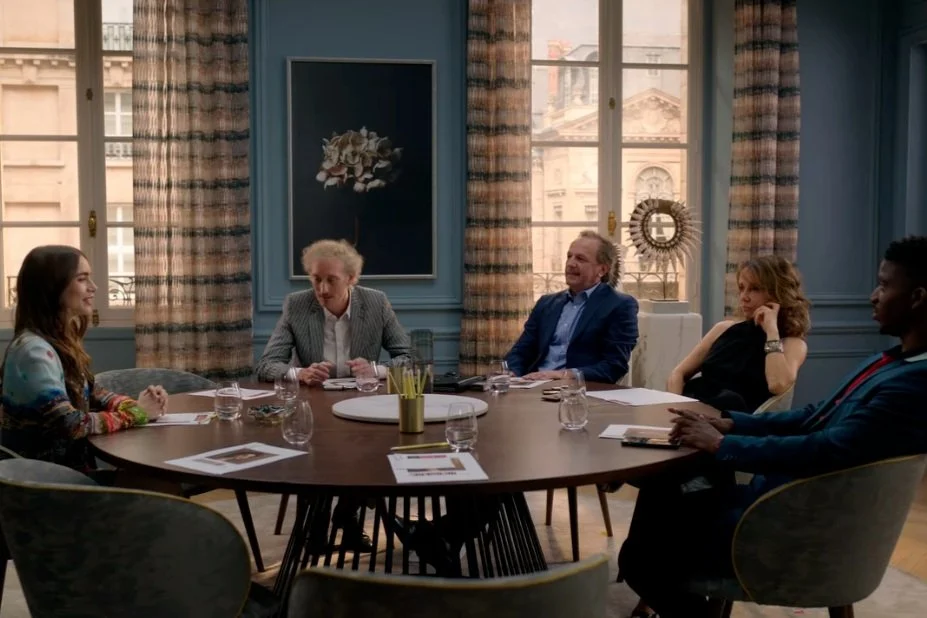 Emily in Paris’te en çok vakit geçirilen yerlerden biri ofis. Alıştığımız sade ve sıkıcı ofis dizaynından çok uzak bir tasarım hakim. Klasiklik ve modernliğin harmanlandığını gözlemliyoruz. Geçmişe bağlı olan yenilikçi bir ofis tasarımı var. Yüksek tavanlar ve açık renk uzun pencereler ofise Fransız dokunuşu veriyor. Duvarda tablolarla da bu doku pekiştirilmiş. Paris tarzı dekorasyonu yansıtan altın renk aksesuarları da görüyoruz.