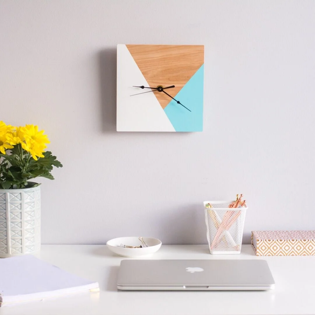 Sıradaki önerimiz dekorasyonda net çizgilere ve yalın formlara yer vermekten hoşlananlar için. Karışık detaylardan uzak, sade görünümlü bir aksesuar elde etmeyi tercih ediyorsan duvar saatini oluştururken temel geometrik biçimlerden faydalanabilirsin. Alışılagelmiş dairesel saat yüzeyi üzerinde geometrik şekiller yaratarak ve saat yüzeyinİ farklı şekillerle ilişkilendirerek bu temiz formları vurgulayabilirsin. Doğru malzemeler ve renkler ile desteklenen geometrik duvar saati, dekorasyonunda karizmatik bir etki yaratmanı sağlayacaktır.